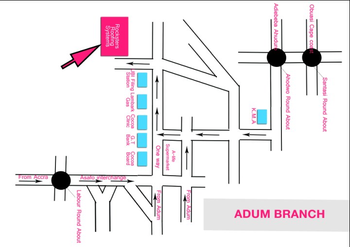 Adum Office : Adjacent Lambark Gas . Off Osei Tutu 1st . Ave. Rd. At Adum Kumasi